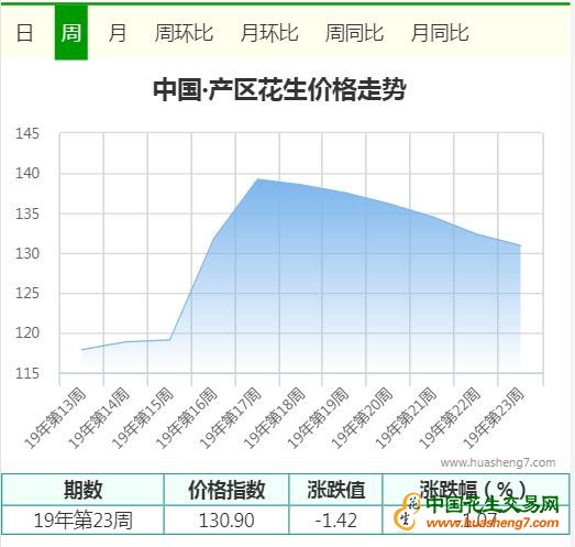 2019年第23周花生周定基指数为130.90点,较2019年第22周132.32点,下跌1.42点,跌幅为1.07%;周环比指数98.93点,比上周下跌0.54点,跌幅0.55%;周同比指数132.45点,比去年同期上涨了32.45%。本周花生周定基指数跌势不减,这主要是由于部分花生产区中间商处理手中存货,以及河南部分产区花生价格涨后回调,花生均价出现走低,带动指数小幅下调。
