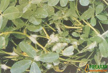 [为害症状]菌侵染可以造成出苗前花生种子腐烂。(1)幼苗:发病后在近土表茎基部产生褐色凹陷病斑,病斑发展环绕茎基和根部引起植株枯死。病菌侵染根系,引起根系腐烂。(2)成株:病害通常在底部叶片和茎开始发生。受病菌侵染在茎、叶尖和叶缘产生暗揭色病一斑,在潮湿条件下,病斑迅速扩展,使叶片变黑褐色干枯卷缩。蛛丝状菌丝由下部向植株中、上部茎和叶片蔓延。在病部产生的灰白色棉絮状菌丝中形成灰褐色或黑褐色小颗粒菌核。发病轻时,底叶腐烂,提前脱落,严重时植株干枯死亡。病菌侵染入土果针和荚果,受侵染荚果品质下降或引起腐烂。