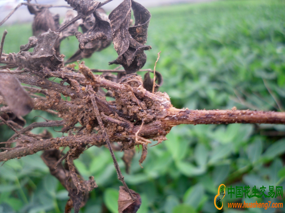[为害症状]花生出苗前,可侵染刚萌发种子,造成烂种。幼苗发病,病菌侵染花生幼苗地下部,主根变褐色,植株矮小枯萎。成株期受害,通常表现慢性症状,开始表现暂时萎蔫,叶片失水褪绿、变黄,叶柄下垂。主根根颈部出现稍凹陷的长条形褐色病斑,根端呈湿腐状,皮层变褐腐烂,易脱离脱落,无侧根或极少,形似鼠尾,植株逐渐枯死。土壤湿度大时,近土面根颈部可长出不定根,病株一时不易枯死。病株地上部矮小,生长不良,叶片变黄,开花结果少,且多为秕果。病菌可侵染进人土内的果针和幼嫩荚果。果针受害后使荚果易脱落在土内。病菌和腐霉菌复合感染荚果,可使得荚果腐烂。