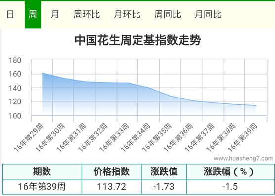 2016年第39周花生价格指数为113.72,较第38周花生价格指数下滑1.73点,跌幅为1.5%,跌幅较上期缩小。同比指数为95.08点,价格略低于去年同期。从整体看,新花生行情开始趋稳,价格波动幅度减小。