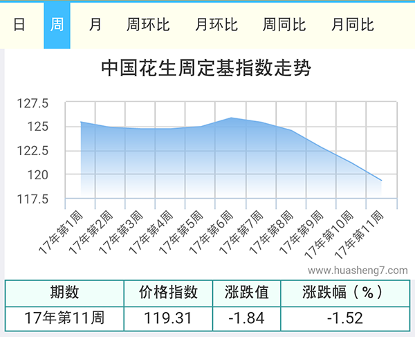 2017年第11周周定基指数为119.31点,较第10周下跌约1.52%,周环比指数为98.48,较第9周下跌约0.21%,周同比价格指数为88.01,较第9周下跌约1.79%。