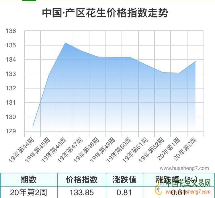 2020年第2周周定基指数为133.85,较2020年第1周上涨约0.61%,周环比指数为100.52,较2020年第1周上涨约0.56%,周同比价格指数为127.67,较去年同期上涨约1.16%。