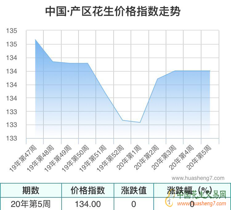 2020年第5周周定基指数为134.00,较2020年第4周无涨跌,周环比指数为100.00,较2020年第4周无涨跌,周同比价格指数为127.97,较去年同期上涨约0.14%。