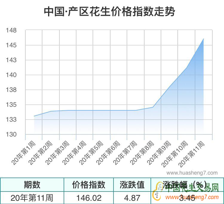 2020年第11周周定基指数为146.02,较2020年第10周上涨3.45%,周环比指数为103.45,较2020年第10周上涨1.13%,周同比价格指数为133.33,较去年同期上涨0.28%。