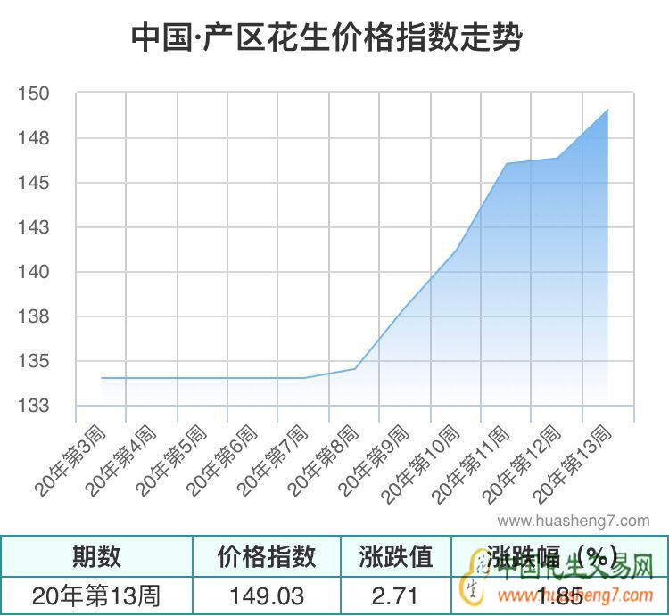 2020年第13周周定基指数为149.03,较2020年第12周上涨1.85%,周环比指数为101.85,较2020年第12周上涨1.65%,周同比价格指数为126.41,较去年同期下跌-2.87%。