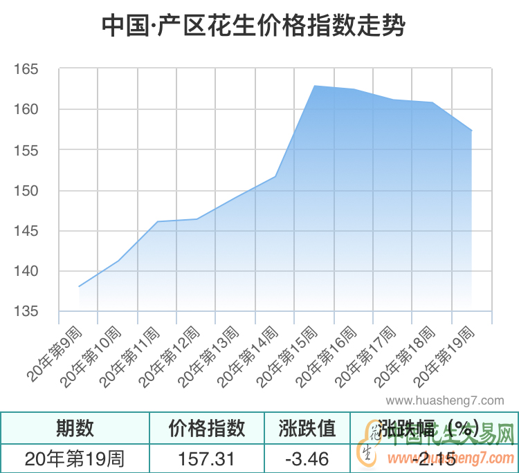 2020年第19周周定基指数为157.31,较2020年第18周下跌2.15%,周环比指数为97.85,较2020年第18周下跌1.94%,周同比价格指数为114.38,较去年同期下跌1.45%。
