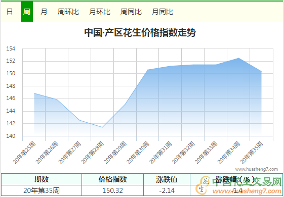 2020年第35周周定基指数为150.32点,较2020年第34周下跌1.40%;周环比指数为98.60点,较2020年第34周下跌2.09%;周同比价格指数为117.07点,较去年同期上涨2.74%。