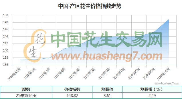 2021年第10周定基指数为148.82点,较2021年第9周上涨2.49%;周环比指数为102.49点,较2021年第9周上涨1.64%;周同比价格指数为103.97点,较去年同期下跌0.1%。