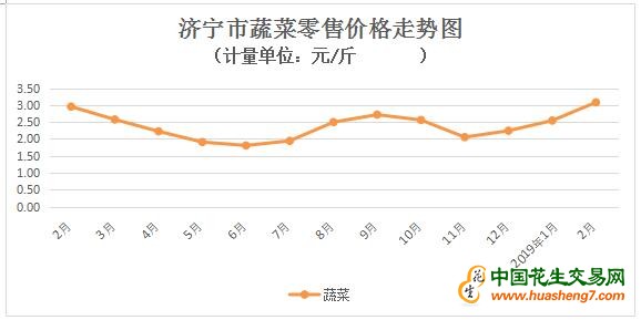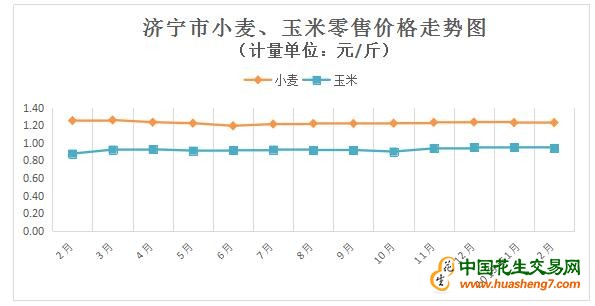 中国花生交易网(www.huasheng7.com)讯 近日,据山东省济宁市价格监测中心最新监测数据显示,2019年2月济宁市主要粮油副食品、肉类、鸡蛋、蔬菜等市场供应充足,价格涨跌互现。主要商品价格呈现以下特点:粮油价格运行平稳,居于全省平均水平;肉类价格震荡回落,鸡蛋价格降幅明显,跌破4元,比全省平均水平低7个百分点;济宁市重点监测的17中蔬菜市场价格呈现“9升8降”态势,均价比全省平均水平低6个百分点;2月济宁市农业生产资料市场小幅变动。